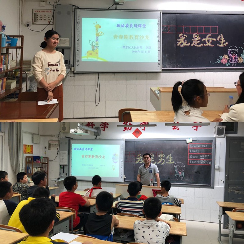 5月11日晚,我院医生俞宇宙、章璟来到溧水区通济街实验小学五年级课堂展开了一堂别开生面的沙龙活动,活动主题围绕青春期少年在青春期的身体和心理变化,组织了《我是男生》、《我是女生》讲座。 医生们课堂上讲了男生、女生的发育特点、青春期将要遇到的身体变化,学习对自己身体正确的理解和行为控制,帮助孩子们消除神秘感和紧张恐惧心理。 医生们教孩子们要学会保护自己,注意青春期的卫生,从手卫生开始,做好预防。 课后,孩子们积极踊跃的向医生们提问自己最关心、最困惑的问题,医生们耐心的给予回答。 最后,医生们对孩子寄语:希望大家集中精力,努力学习,在保护好自己的同时,积极参加各种文体活动和社会活动,同学间互相帮助,跟师长密切交流,健康的度过这人生的金色年华。