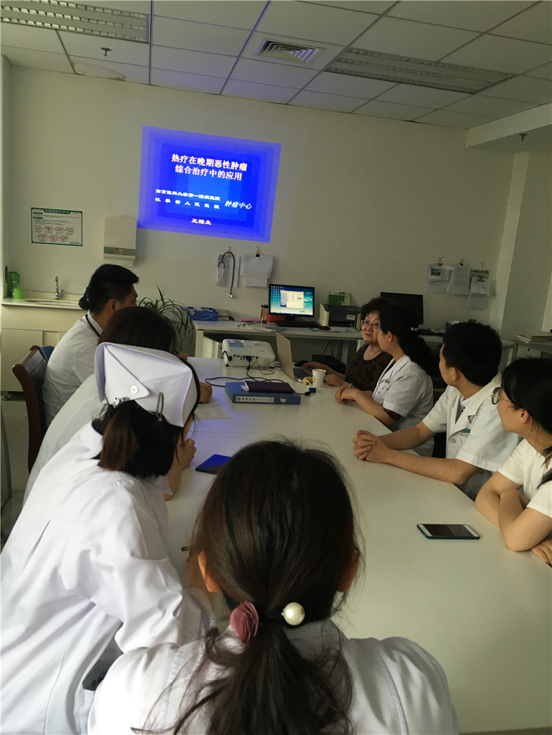 五月是一个充满希望的月份,5月19日上午,江苏省人民医院肿瘤内科的王榕生主任来访我院肿瘤内科。她的到来主要是为我们进一步介绍肿瘤内科一项专科技术——深部热疗。她的倾心讲解无疑推进医务人员对热疗的更深一步的了解与应用,同时也给我们病区的病人带来新的希望。 全科室的医务人员都特别珍惜这次学习的机会,准时来到医生办公室来听王主任的讲座,而王主任也不负所望地给我们带来一场关于热疗的精彩讲座。通过王主任的介绍,我们了解到了热疗是一种安全、有效、无毒副作用的“绿色疗法”, 通过局部加热能够有效杀伤肿瘤细胞,提高机体免疫力,延长肿瘤患者的生存期、提高生存质量,并可增加放化疗的敏感性,减轻放化疗的毒副作用。热疗根据不同的物理量因子种类分为三类:微波加温、射频加温、超声加温。我们科现在开展的是射频加温,它的适应症很广:人体胸腔、腹腔、盆腔、骨骼部位的浅表及深部的原发、复发的恶性实体肿瘤或转移肿瘤以及术后可能存在的亚临床病灶,尤其对缓解中晚期恶性胸腹水效果显著。热疗这一肿瘤特殊治疗方法有良好的疗效,大大提高了肿瘤患者的生存质量。 除了理论方面的讲解,王主任还注重实际操作。她亲临了我们的热疗室,亲自给我们演示上机操作的步骤及上机操作中的注意事项。经过她的理论与实践相结合的详细介绍,我们每个人对热疗有了更深刻的了解,今后的工作中,我们将会为病人提供更好更优质的服务!