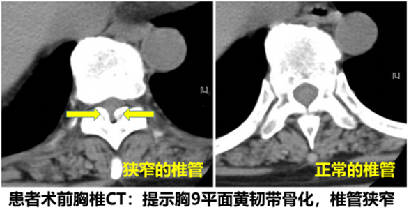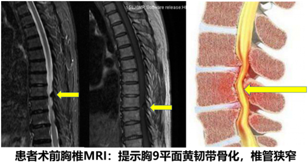 57岁的周女士也不幸得了胸椎管狭窄症,一边是日益加重的胸腹部束带感,就是感觉胸口及肚子上被布带勒紧的感觉,还有双下肢无力、麻木、足不能背伸、不能行走,已经出现截瘫的症状,并且越来越严重,只能长期卧床;一边是手术的极大风险,多地多处就诊无果后,慕高增鑫副院长之名到我院脊柱专家门诊就诊,被诊断为“胸椎管狭窄症、胸9黄韧带骨化症、双下肢不全瘫”。