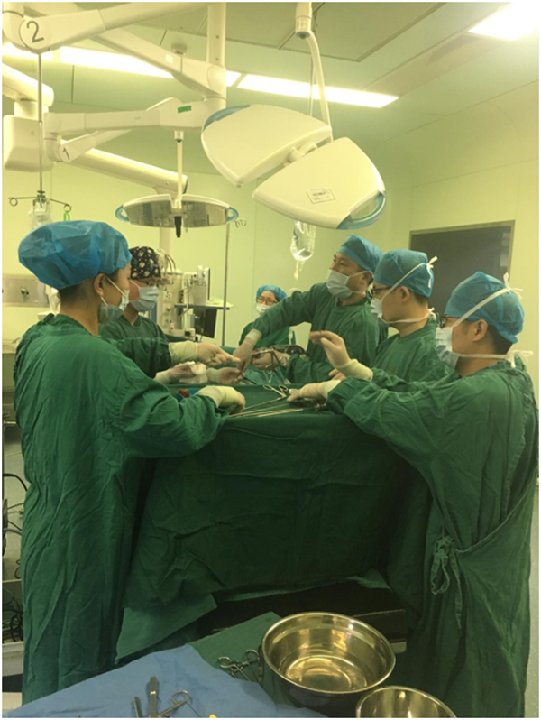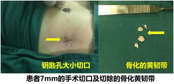 2018年05月24日,经过周密的术前讨论,详细制定手术计划,在手术室全体医护人员的精心配合下,高增鑫副院长亲自为患者实施了“经皮内镜胸椎骨化黄韧带切除,胸椎管减压”,手术历经 2个小时,最终成功为患者解除了胸椎脊髓的压迫,术中基本无出血,术中在去除骨化的黄韧带减压后,3年的不全瘫即刻改善,患者胸腹部紧箍束带感消失,双下肢随即温暖轻松,足背伸功能恢复,术后第一天双下肢即可直腿抬高。