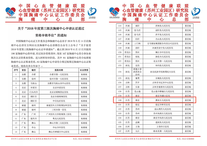 6月12日,我院通过中国胸痛中心基层版申请认证资格审核,这标志着我院胸痛中心向通过中国胸痛中心认证迈出了实质性的一步。6月15日,在南京市鼓楼医院举办的南京地区胸痛救治中心建设大会暨南京地区胸痛救治中心全市模式启动会上,我院被确认为南京地区市级胸痛救治中心建设单位,副院长杨兵全领取授牌,我院心内科主任戴启明被聘为胸痛中心建设专家组成员。