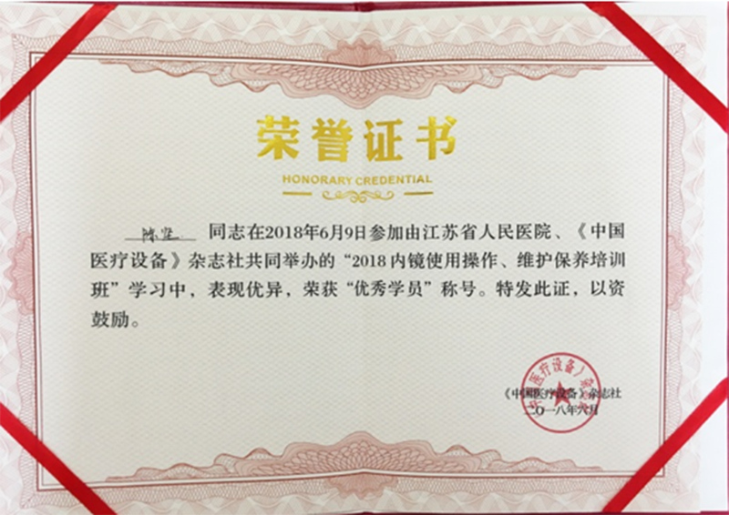 2018年6月9日,由江苏省人民医院与《中国医疗设备》杂志社共同举办的“2018内镜使用操作、维护保养培训班”在南京开班,我院设备科领导本着学习技术,共同进步的原则积极组织同志前往学习。设备科集体同仁也认为如内窥镜一类的高精端医疗设备的技术学习是十分重要的,有助于提高科室专业技术水平,应当高度重视。 现代化的科学技术快速发展,各种先进的医疗设备在医院中得到广泛应用。由于直接关系到医疗质量甚至患者及医护人员的安危,控制好医疗设备的质量,是医院义不容辞的责任,也是一个医院服务质量和社会信誉的体现。而细分到内镜,则可通过质控发现内镜故障部位,及时处理,保障病人安全,减少维修费用。 在为期两天的内镜运维技术学习活动中,我院设备科陈坚同志十分重视此次学习机会,积极参与课程并认真学习思考,与讲授老师及众多学员一道讨论内镜技术发展过程中的各类新型问题。技术的载体是人,只有付出努力才能掌握技术。在本次学习活动落下句号之时,我院陈坚同志荣获“优秀学员”称号,这是对他个人努力的赞誉,也是对我院不落后时代的学习精神的鼓励! 活动结束后,陈坚同志又迅速回到工作岗位,继续努力工作,把本次活动中的所学知识结合我院医疗设备实际使用情况做了进一步的应用延伸。透过此次学习活动,不仅提高了我院设备科内镜质控的技术水平,而且增强了全科全员的学习热情,为今后的医疗学习工作提供了一个很好的示范。