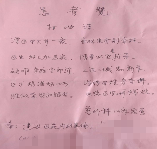 8月25日晨,南京市溧水区人民医院普外科的医生像往常一样,有条不紊的开展一天的工作;早交班之后便开始了当天的查房;与往常不同的是,今天收到了一份意外之喜。便是上面这首打油诗,本诗是由一位在院患者家属叶先生所做;用以表达对本院普外科医生护士的感激之情。 患者陈女士既往有胆囊结石病史,并多次引起急性胆囊炎发作;仅今年上半年就已发作两次,既往发作时均行输液治疗而好转,因考虑急性期手术风险较大而未行手术治疗。患者自诉日常生活中常有右上腹部不适感,深受其苦。8月22日凌晨陈女士再次出现右上腹部疼痛,进行性加重。来我院急诊就诊,予以输液治疗后患者症状无明显缓解,想起之前的发作病史,陈女士及其家属心急如焚。 正当陈女士及其家人为没有更好的治疗方案而忧虑时,听说近几年溧水区人民医院与东南大学附属中大医院合作后医疗水平不断提升,并开设高级专家门诊为患者提供更好的诊疗服务。院长嵇振岭是留学德国的普外科知名专家,国际肝胆胰外科学会(IHPB)委员、国际大肠癌学会(ICCRC)发起委员会委员,博士生导师,主任医师,且享受国务院政府津贴。近期本院普外科团队又有新进专家张恒博士、主任医师、硕导,均具有丰富的临床经验和高超的专业造诣;遂抱着试试看的想法于8月22日上午来到我院高级专家门诊就诊。当天坐诊的正好是我院普外科主任张恒博士,在详细了解患者情况后,考虑患者急性胆囊炎发作时间短,基础情况尚可,建议患者可行手术治疗。在听到能行手术治疗解决病痛后,陈女士喜出望外,因其既往急性胆囊炎发作时均以保守治疗为主,本次发作能行手术治疗,在家门口的医院尽快解决病痛是再好不过的选择。 陈女士遂于当天入院,第二天便接受了腹腔镜手术。术后第一天患者自诉感觉良好,腹痛明显缓解,在病房护理人员的指导下已能下床活动,进食少量流质。术后第二天患者精神状态良好,无明显腹痛,逐步恢复正常饮食。患者家属叶先生看到患者病情明显好转,日渐康复,脸上也露出了久违的笑容;爱好文学的他在情不自禁之际便写下了这首打油诗,以表达其谢意。 患者赞 打油诗 溧医中大并一家,来院患者别牵挂; 医生护士加专家,博导必要来指导; 疑难杂症全部消,三进三城翻新章; 医术精湛扬四方,深得百姓来夸讲; 胜似金奖和银奖,医德医风再辉煌。 张恒主任说道:急性胆囊炎是普外科常见急腹症,由于局部充血水肿, 周围粘连,特别是 Calot 三角粘连增厚,解剖关系不清,导致术中出血多、胆管损伤危险性增加、并发症增多等问题,曾被列为腹腔镜胆囊切除术的禁忌证。所以对于急性胆囊炎的治疗方案通常是保守治疗,3月后待炎症消退后行胆囊切除术。然而有部分病人“坚持”不到3个月就再次发作,该例病人就属于这种情况。随着腹腔镜手术的广泛开展和技巧的不断提高,胆囊炎急性发作期已不再是腹腔镜手术的禁忌症。对此类特殊类型的胆囊炎,如何把握手术时机,提高手术技巧,减少并发症尤其重要。一般来讲,胆囊急性炎症 48小时以内,胆囊壁只有水肿而无明显充血,局部粘连疏松,Calot 三角结构因疏松结缔组织水肿而更易分离暴露。超过72小时则难度明显增大,此时胆囊与周围组织粘连广泛,解剖层次欠清楚,Calot 三角水肿明显。因此,多数学者认为选择适当时机进行手术是腹腔镜手术治疗急性结石性胆囊炎的关键所在,并将症状发作后 48小时内作为手术最佳时机。另外,必要的中转开腹是手术成功的重要保障,对于胆囊三角严重粘连经耐心细致解剖亦无结果者,出血难以控制者,Mirrizzi综合征者,十二指肠、结肠内瘘及高度怀疑有胆管损伤者,要毫不犹豫中转开腹。 不可因为手术适应证的放宽而盲目追求腹腔镜手术的成功,患者安全是第一位的。 本次手术在一定程度上改变了我院既往对于急性胆囊炎的治疗理念。体现了我院在与中大医院合作、高层次人才引进后,临床诊疗技术水平的提升。相信随着进一步发展,人才队伍的不断壮大,我院的医疗水平会有更大的进步,为本地区老百姓的健康作出更大的贡献。